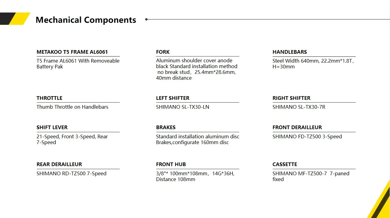 Technical SpecsMotor: 350W BAFANG high speed brushless motors